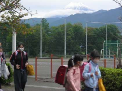 天気が周期的に変化し始めました。週末に雨、晴れと来て、今日は雨が降りそうです。富士山にははっきりと冠雪が見られます。3年生が社会科見学に出かけますので、あまり降らないでほしいと思っています。