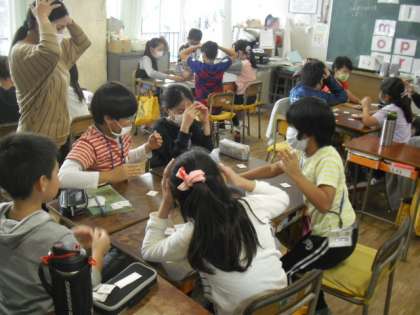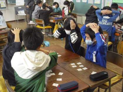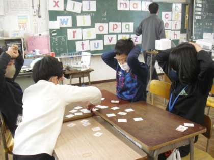 4年生の英語の授業です。アルファベットの小文字カルタで楽しんでいます。