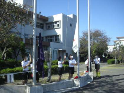 開会式です。国旗・市旗・校旗の掲揚、スローガンの発表です。