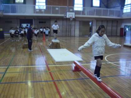 2組は体育です。跳び箱や平均台を使ってのサーキット運動です。