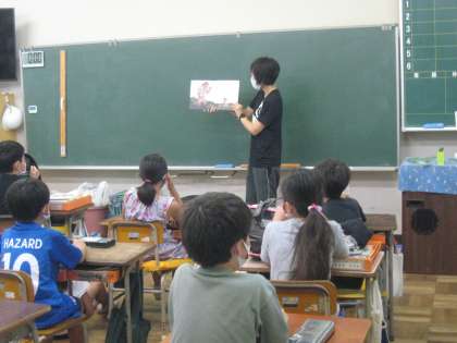 2組では、ちょっと、英語も混じった物語を読んでくださいました。