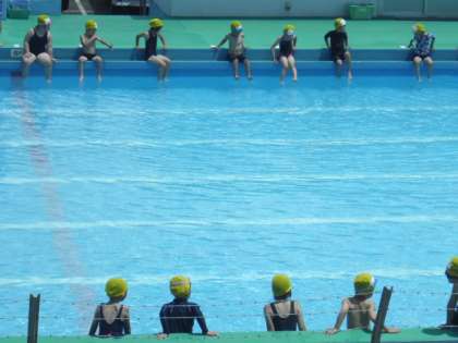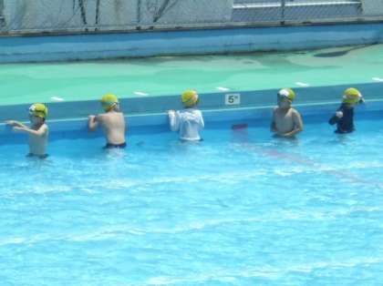 1年生は小学校のプールに初めて入ります。うれしそうな声、ちょっぴり怖そうな声、みんな歓声を上げながらプールに入っていました。朝降っていた雨も上がり、水泳日和になりましたね。