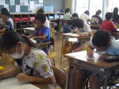 6年生の様子です。始業式を終え、早速、確認テストに取り組んでいます。