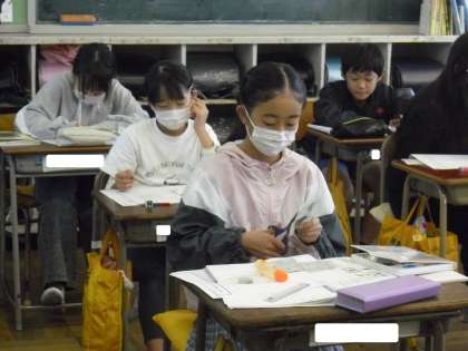国語「新聞から情報を読み取ろう」の授業です。興味のある記事を切り取り、その記事に対する自分の考えをまとめているところです。
