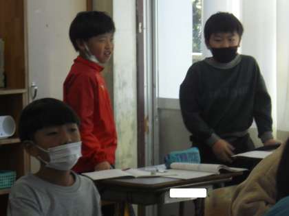 算数の授業です。長さや かさを 帯分数や仮分数で表す問題に挑戦しました。ペアで答えを考え、ペアで発表していました。