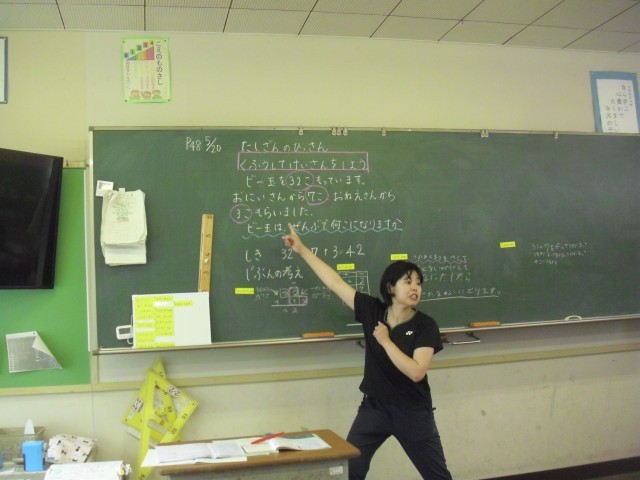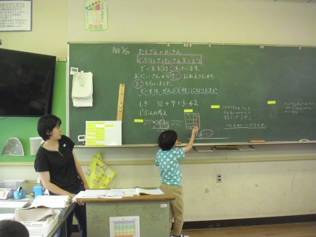 算数の授業です。三口の計算の方法を考えています。どのように計算をしたら簡単にできるのか、自分の考えをみんなの前でわかりやすく説明することができます。思考力が育っています。