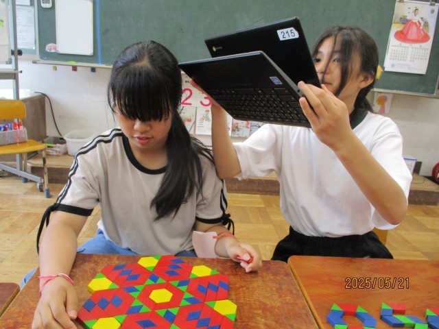 パタンブロックで創りだした作品を撮影し,大型モニターにつなぎ互いに伝え合いアイデアを豊かにしていきました。