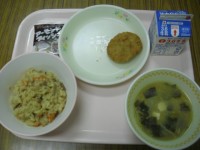 今日の給食 五目炊き込みご飯 牛乳 静岡県産枝豆コロッケ 玉葱とえのきのごま味噌...