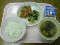 今日の給食 ご飯 ふりかけ 牛乳 鶏肉とジャガイモの揚げ煮 わかめスープ いた...