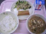 今日のメニューは、ごはん、牛乳、マーボー豆腐、揚げ春巻き、もやしと小松菜のナムル...