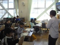国語の授業です。かさこじぞうの音読の練習をしています。みんな上手ですね。
