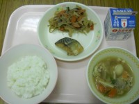 今日の給食 ご飯 牛乳 鯖の味噌煮 根菜の炒め物 芋団子汁 いただきます。