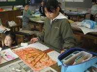 図工の授業です。スタンプなどを使って絵画を作成しています。様々な技法を使って、...