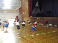 体育の授業です。準備運動をしています。体育係を中心にしっかり体を温めています。