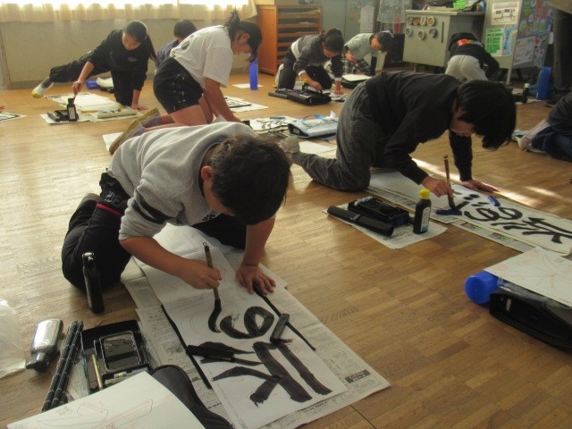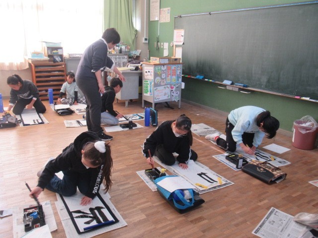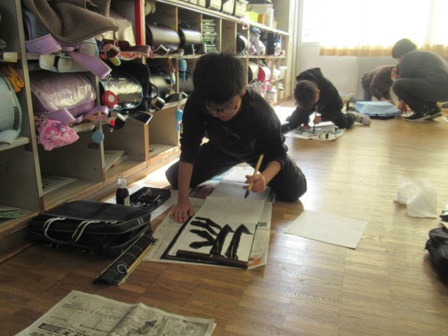 教室の机や椅子を廊下に出し、床を広く使って、書き初めの練習をしていました。