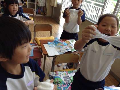 紙粘土を伸ばして柔らかくします。「こんなに伸びたよ。」とうれしそうに見せてくれました。