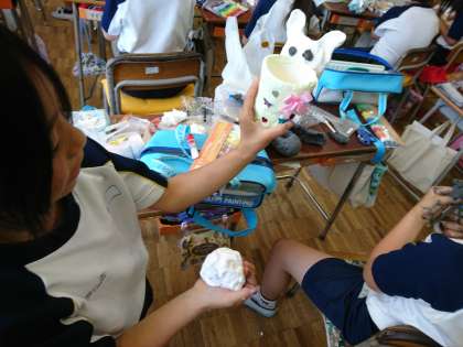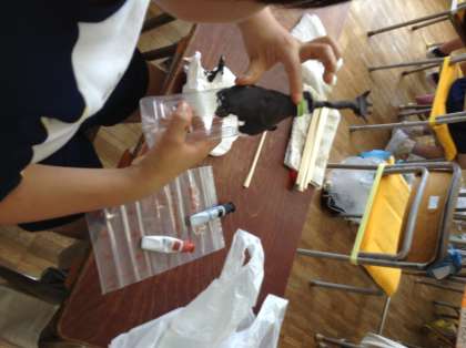 その後、びんや卵のパックに着色した紙粘土を付け、作品を仕上げていきます。