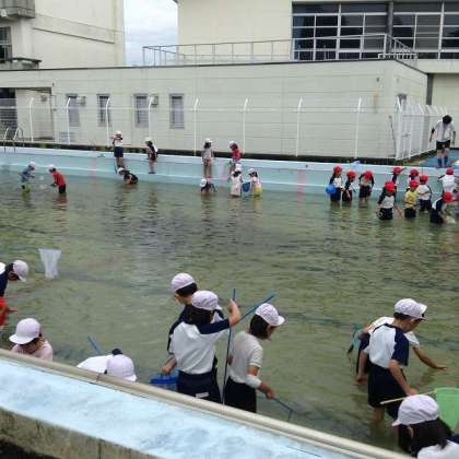 プール清掃前に、2年生が水の中の生き物を探しました。