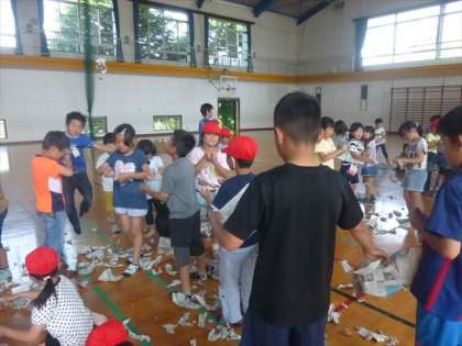”突撃”の後は、皆で破れた新聞紙をビリビリに破き、残ったゴミを集めました。