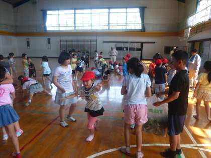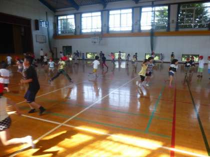 次に、低学年・高学年に分かれて「手つなぎオニ」をしました。最後までうまく逃げることができた子供もいたようです。96名の児童と11名のボランティアで楽しく活動できました。