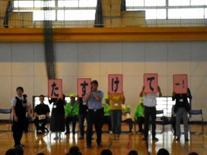 「たすけてー!」と大きな声を出す練習をします。