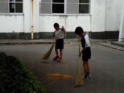 環境委員会が、児童玄関前の落ち葉掃きに取り組んでいます♪