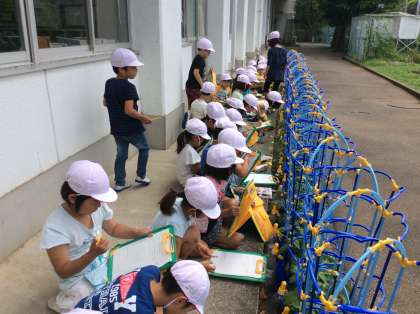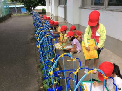 1年生は、生活の授業で朝顔の様子を見ました。前と比べて葉が大きくなっている、多くなっている、形が違っている、色が濃くなっている、手触りがざらざらしている、など色々な視点から見ました。花が咲くのが楽しみです。