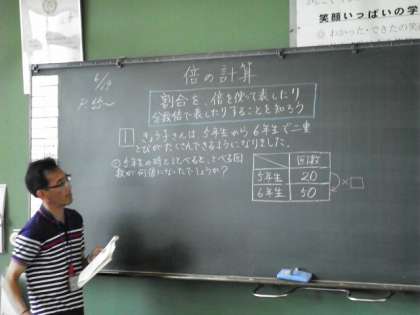 学習問題「割合を倍を使って表にしたり、分数倍で表したりすることを知ろう」に取り組みます。