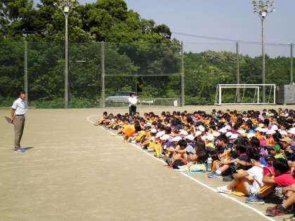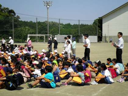 全児童が運動場に避難し、人数を確認します。