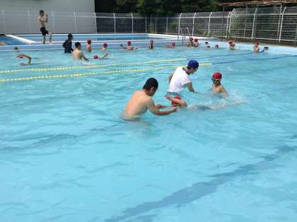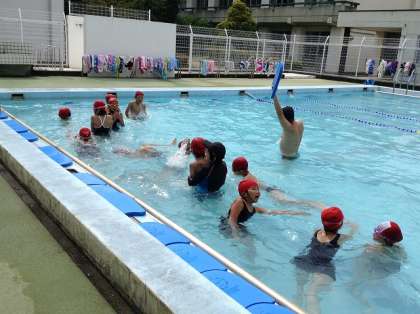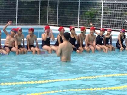 「チーム学校実現事業」の「地域人材による学校応援事業」の一環として、外部講師を招いての水泳教室が実施されました。トップバッターは4年生。泳力に応じて指導をしていただき、次のステップへのこつを掴んだようです。