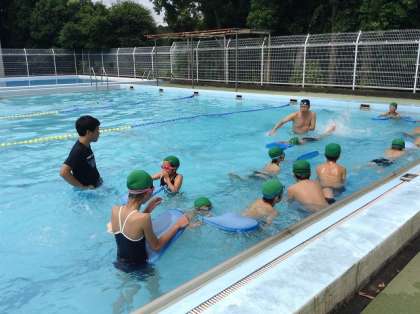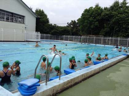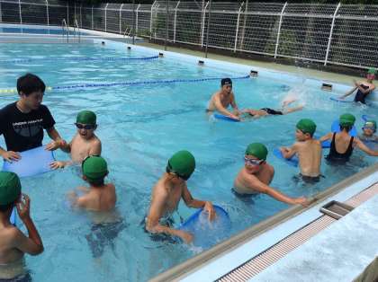 東部スイミングより招いた講師による水泳教室の3日目。今日は、5年生が教えていただきました。