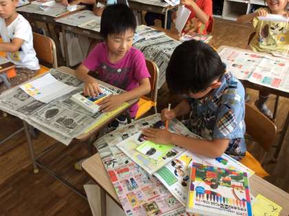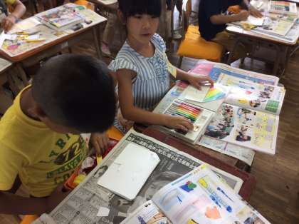 1年生は図工の授業で「おってたてたら」にチャレンジしました。画用紙を折って立ててみて、何に見えるかを考えて絵を描きました。