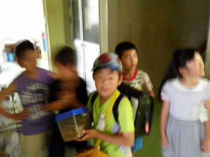 3年生が、虫かごのカブトムシがとてもうれしそうです♩