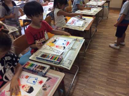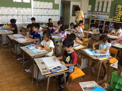 1年生は図工の授業で、「1学期の思い出」の絵を描きました。遠足、プール、色々な思い出を話しながら楽しそうに描いていました。