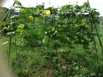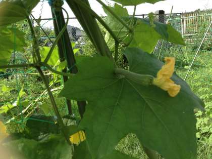 ゴーヤの実がなりました。図書館開放の日なので、来校した4年生に声をかけていきたいと思います。ヘチマは雄花がたくさん咲いています。雌花は1輪咲いて、実ができはじめました。台風などに負けず大きく育ってほしいと思います。学校に来ることがあったら是非観察してください。