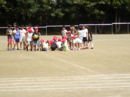 運動場にいた子どもたちは、グラウンドの中央で地震の揺れが収まるのを待ちます。