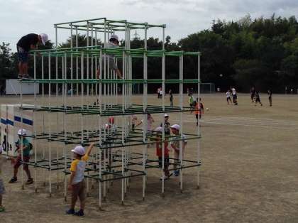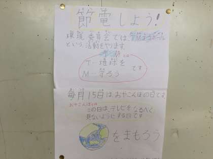 昼の放送で、環境委員会から「TMエコボール」の活動の紹介がありました。「Tは地球、Mは守る。エコを進めるために、昼休みは室内の電気を消して、外で遊びましょう」という投げかけを受けて、昼休みは運動場でたくさんの子が遊んでいました。