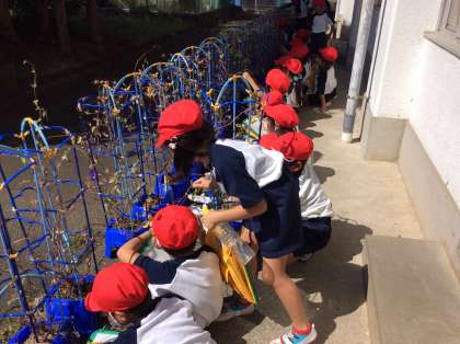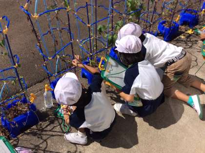 1年生は、夏休みが終わってから初めての朝顔の観察をしました。夏休み中に花が枯れ、たくさんのたねができていました。