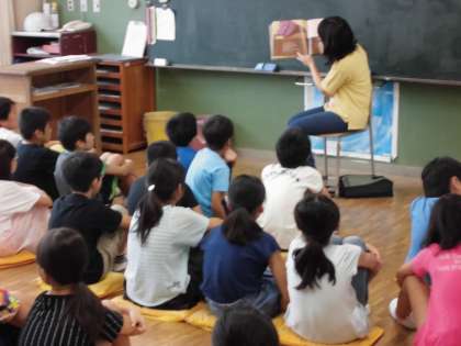 5年1組で読んでいただいた本は、『王さまライオンのケーキ』です。分数や倍数をおもしろおかしくストーリーになっていて、楽しみながら聞いていました。