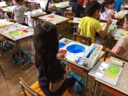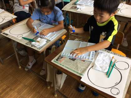 1年生は、初めて絵の具セットを使って学習をしました。水がこぼれないように、絵の具を出し過ぎないように、緊張しながら支度をし、絵の具をつけてシャボン玉を塗りました。楽しそうに色を選んで取り組んでいました。
