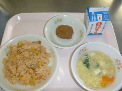●ジャンバラヤ ●牛乳 ●かぼちゃチーズフライ ●卵と小松菜のスープ