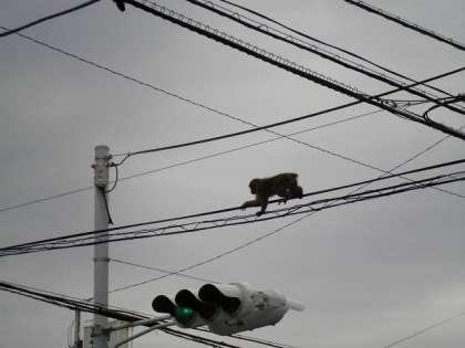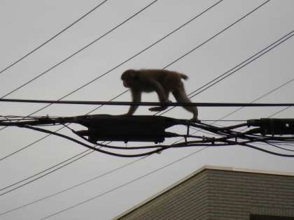 今日、午前7時25分頃、根方街道・大中寺交差点の電線にサルが出没しました。