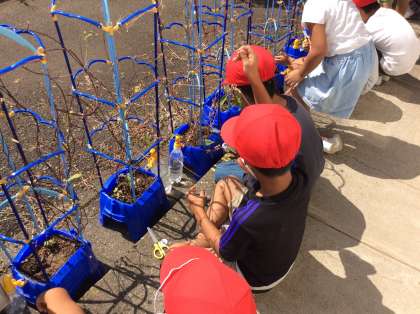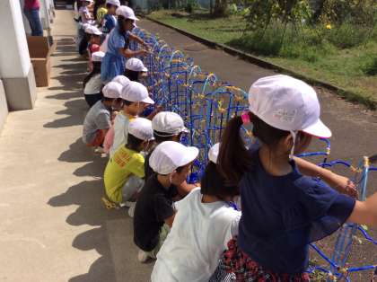 1年生は、生活の授業で育てていたあさがおのつるを使って、リース作りをしています。今日は、あさがおのつるを取って、基となるリースの形を作りました。図工の授業で飾り付けをする予定です。どんなリースができあがるか楽しみです。
