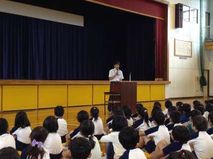 校長先生が、朝運動で6年生や1年生と一緒に走った体験から、「学校は集団生活の場で、いろいろな個性や能力をもった人たちの集まりです。だから意味があるのです。競い合い、応援し合い、お互いにグングン成長していきましょう。」という内容です。