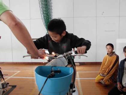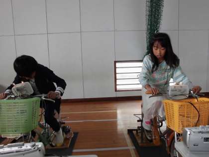 校長先生も”自転車発電”に挑戦!