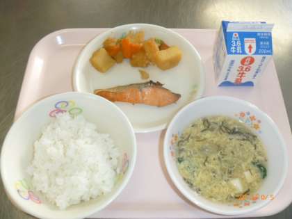 ●ごはん ●牛乳 ●焼き塩鮭 ●じゃが芋の甘辛煮 ●もずくと卵の汁