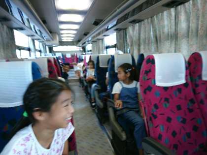 ひもの工場を出発しました。帰りのバスは、1号車に明治史料館、中沢田で降りる子が乗っています。中沢田で降りる子はたけのこに向かいます。