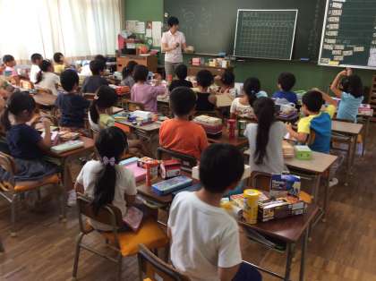 1年生は、算数で「かたち」を学習しています。自分が集めて持ってきた箱を、なかまわけしたり、形を写したりして、箱の形の特徴を捉える学習をしました。