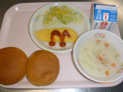 ●丸形パン ●牛乳 ●クラムチャウダー ●オムレツ ●ボイルドサラダ