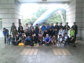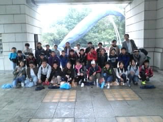 国立科学博物館で、クジラのオブジェをバックに学級写真 「ハイ!チーズ」